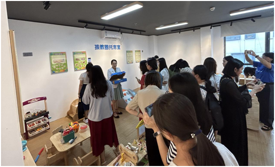 在参观托育室时,国培班老师在孩教圈老师的带领下欣赏了托育室的环创,体验了不同区域托育玩教具的玩法等。不少国培班老师都对托育室的环创布置、区域划分、配套的玩教具、原创的动物主题家具给予了高度评价,认为其具有创新性和先进性,符合托育阶段幼儿的心理特征和学习能力,能够很好地促进托育阶段幼儿的全方面发展。