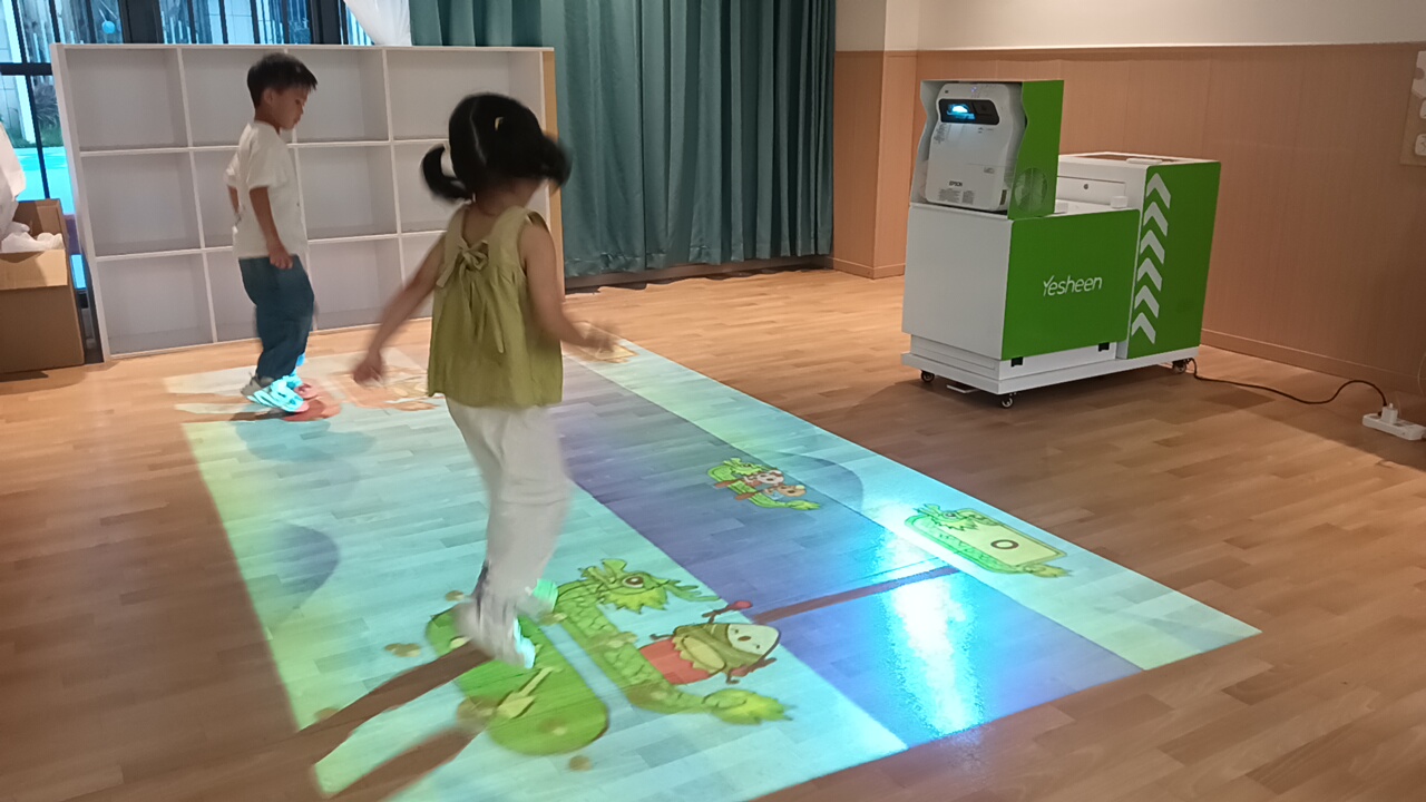 将立体逼真的动画画面投射到地面营造身临其境的游戏场景,同时利用触摸雷达互动技术实现人与动态画面的实时交互,增强游戏的交互性、趣味性。