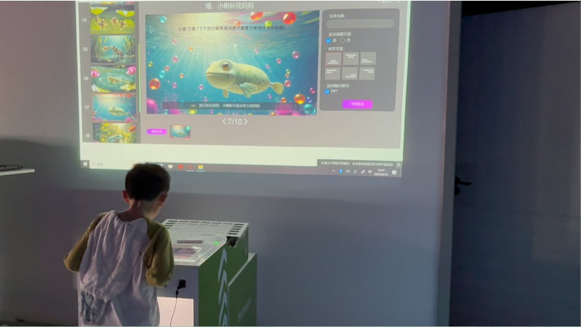 AI绘画利用高拍仪扫描上传儿童绘画作品,使得绘画作品可由纸上静止作品变成投影在地面的3D立体动画,儿童还可通过雷达技术与投影画面进行实时互动。