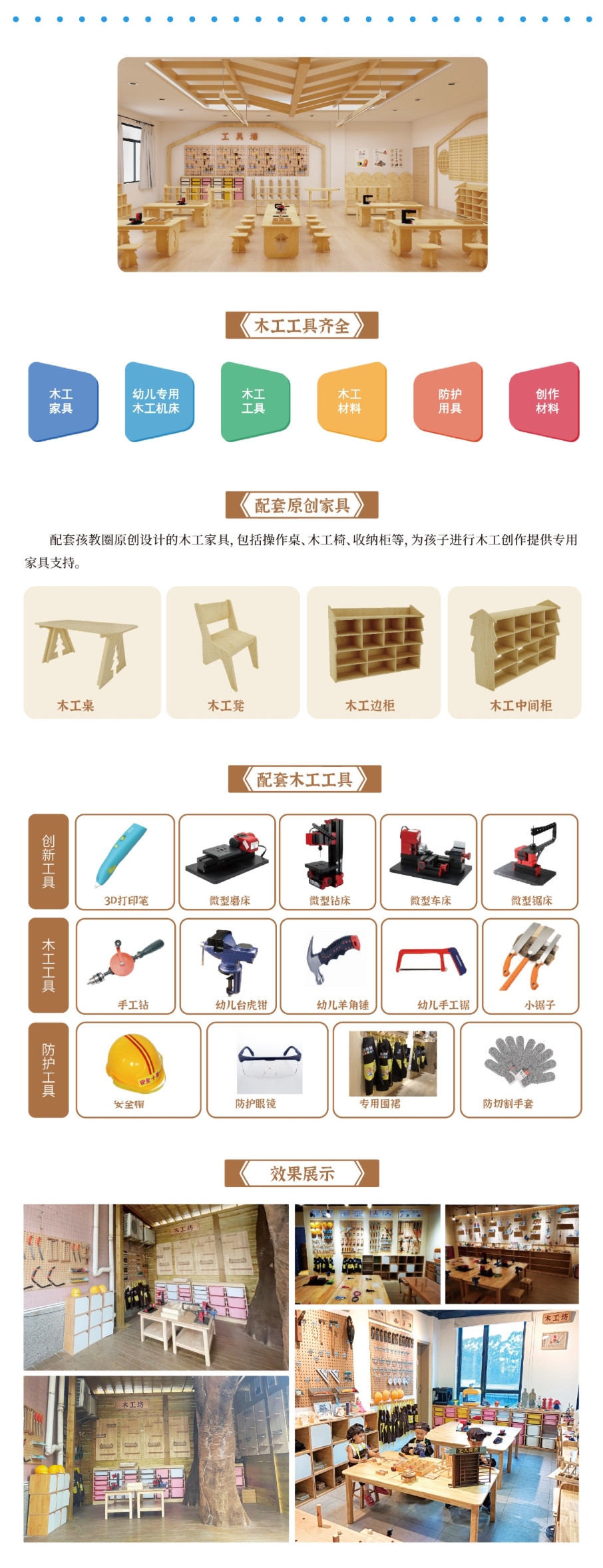 孩教圈幼儿园“木工坊”非遗教室是专为幼儿园打造的木工创作、作品展示、工具