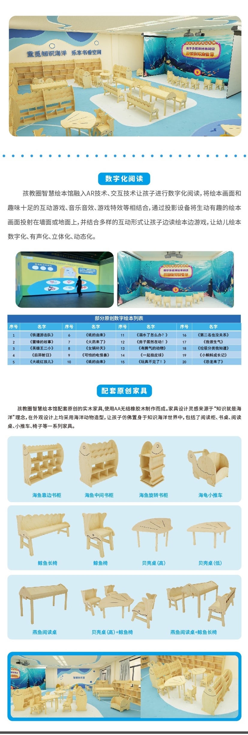 孩教圈“智慧绘本馆”以数字化阅读为核心,通过融合AR技术、交互技术,为幼儿带来交互式、游戏式、情景式、沉浸式的身临其境阅读体验,同时通过原创的绘本馆家具和引进1000多套国内外经典绘本故事,帮助孩子在轻松趣味的阅读活动中形成良好的阅读习惯和培养良好的语言表达能力。