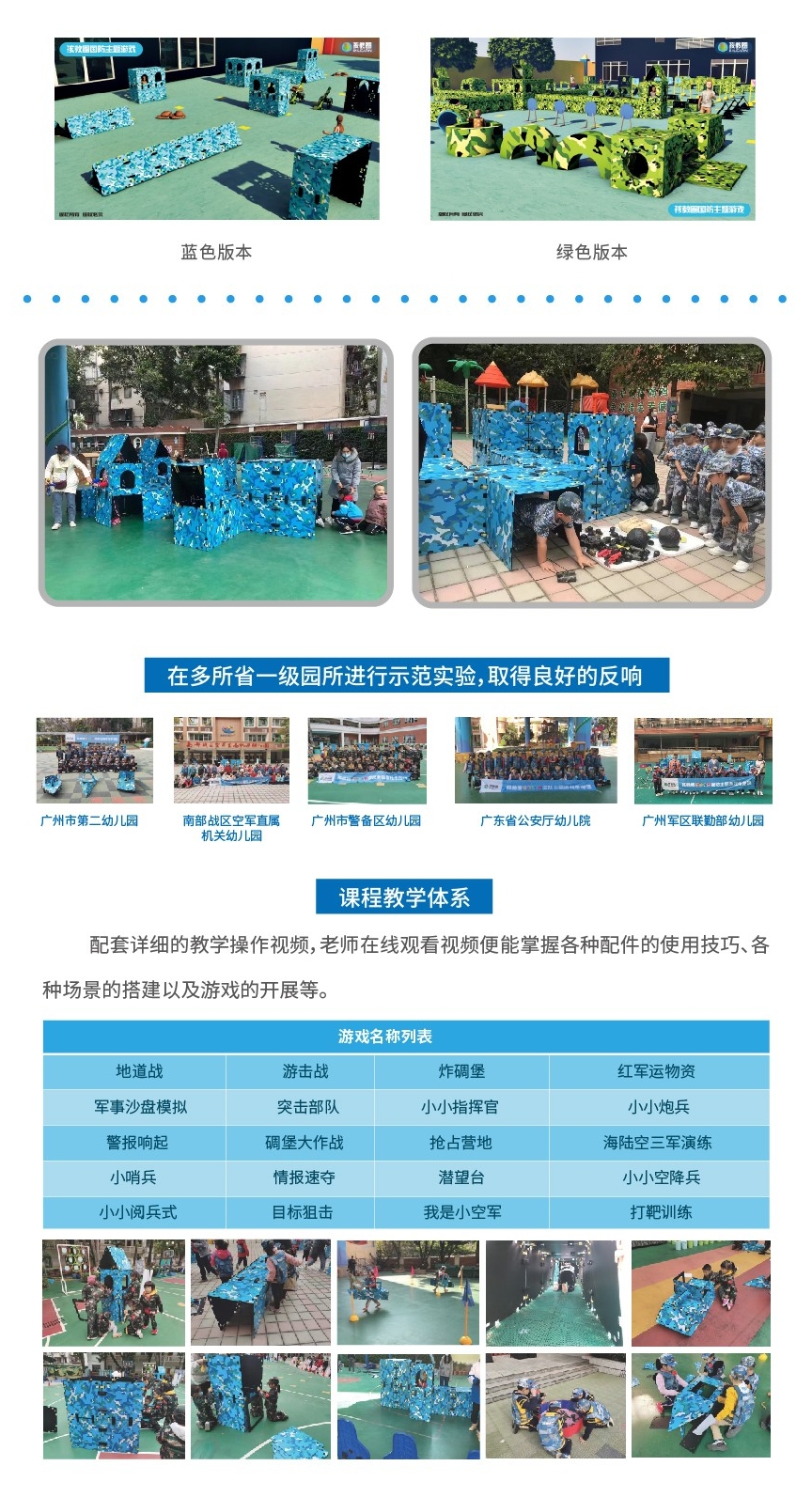 游戏根据迷彩服特征, 设计了蓝色和绿色两种版本, 可满足不同幼儿园的需求。