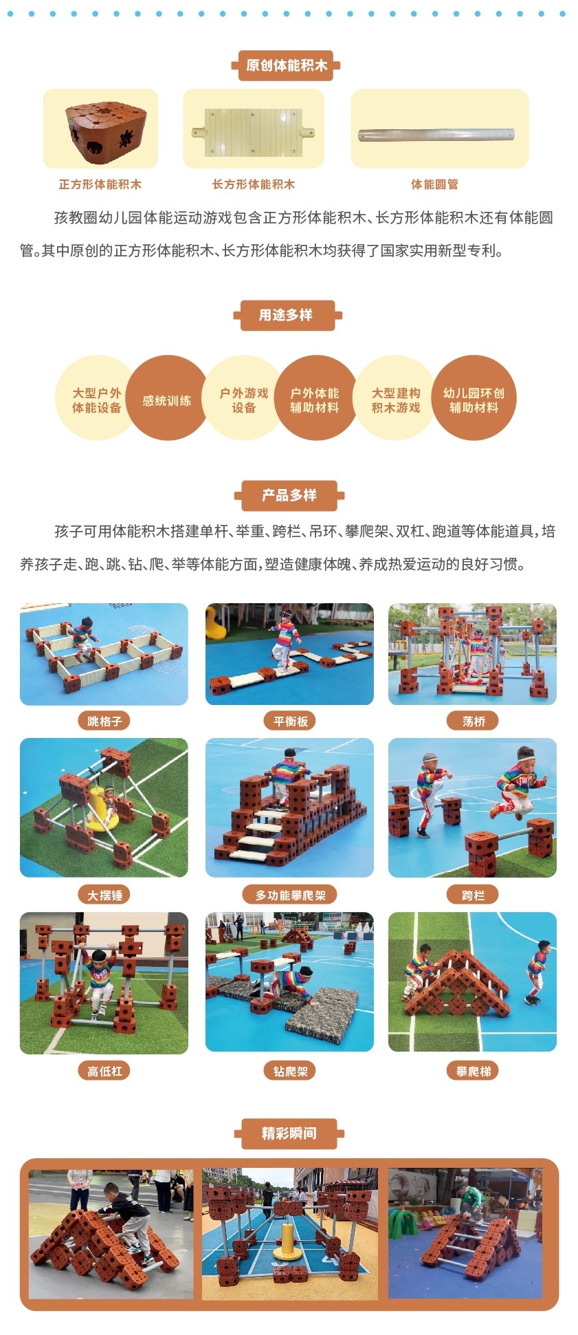 孩教圈 “百变体方” 体能游戏以体能为核心,融合户外游戏、大型建构 、STEAM等多领域游戏。可搭建大型户外体能设备、感统训练、户外游戏设备 、户外体能辅助材料、大型建构积木游戏 、幼儿园环创辅助材料等用途。提供原创的体能道具,幼儿可自主搭建体能造型,培养孩子走、跑、跳 、钻 、爬等体能方面,爱上运动。结合STEM的创新教学理念,融入了工程 、技术、科学、 数学 、艺术的学科综合教育。为幼儿园开展体能活动+户外游戏提供科学的整体方案。