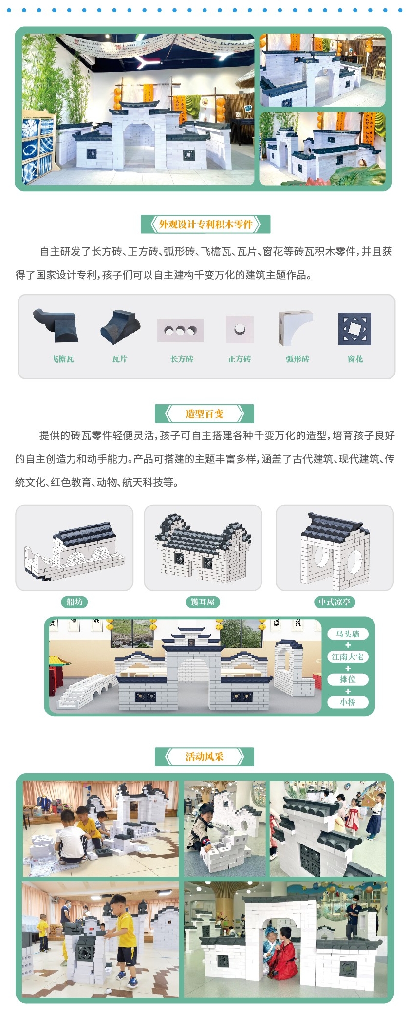 孩教圈"新国风积木建构游戏" 以“新国风”建筑为设计依据,以建筑文化为核心,融合工程建构、数学思维 、美育美学为一体。结合STEAM 理念, 引入科学、技术 、 工程 、 艺术、数学等跨学科知识。积木按照传统"砖、瓦"真实比例,让孩子在一砖一瓦中传承中国古代建筑之美。孩教圈提供自主拼搭的场景材料和丰富的道具材料,配置实操性的指导方案。