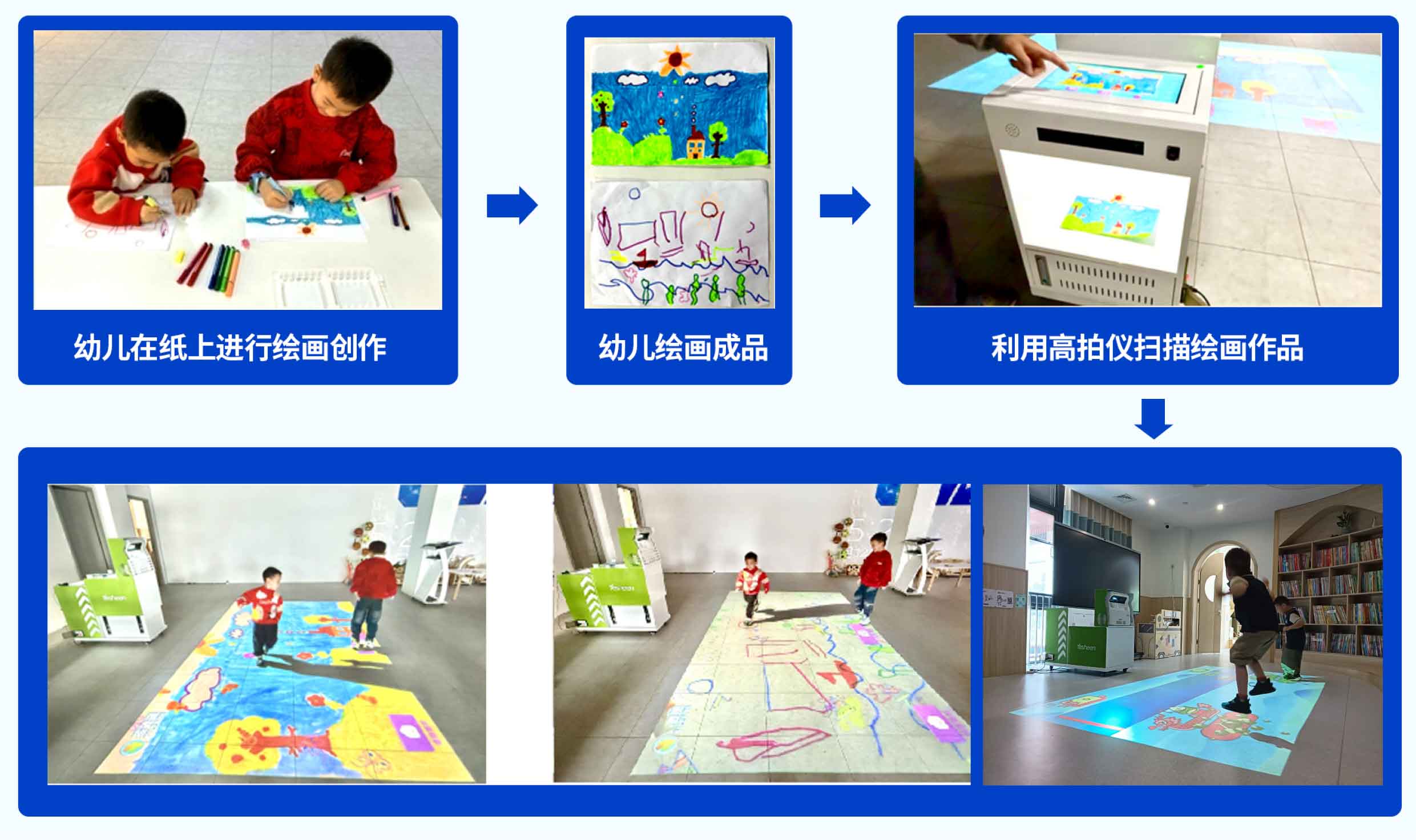 高拍仪上传画作,纸上静止作品秒变投影在地面的游戏元素。跑一跑、跳一跳还可与投影画面实时互动。