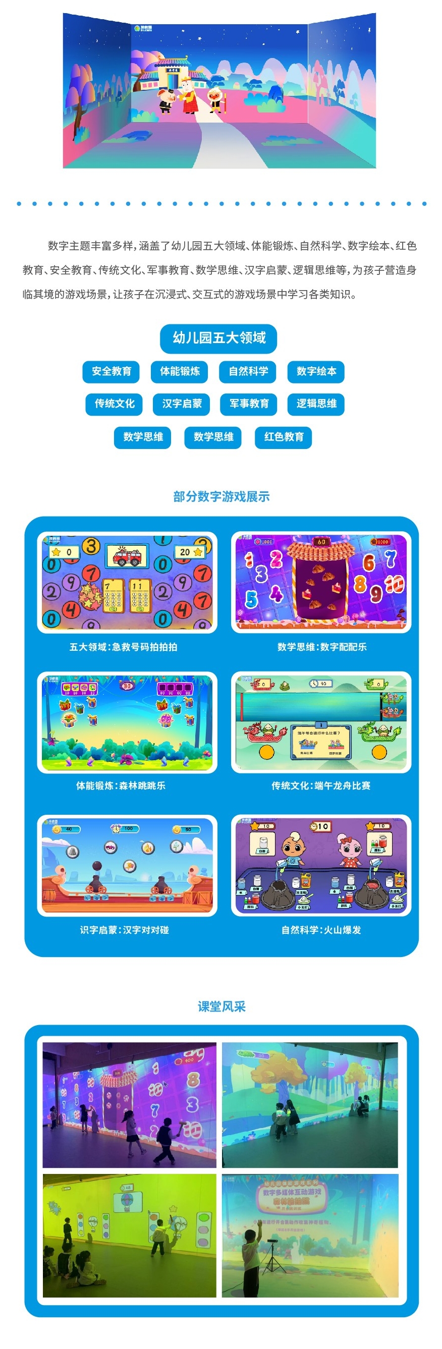 孩教圈融合“互动多媒体、3D、裸眼全息、AR/VR/MR、人机智能交互”等技术,将动画画面投射到地面或墙面,通过动态捕捉技术实现人与动态画面的实时交互,营造身临其境般的沉浸式场景,让孩子仿佛置身于各种真实场景中,进行情景式、沉浸式、交互式、游戏式的数字化教育内容。
